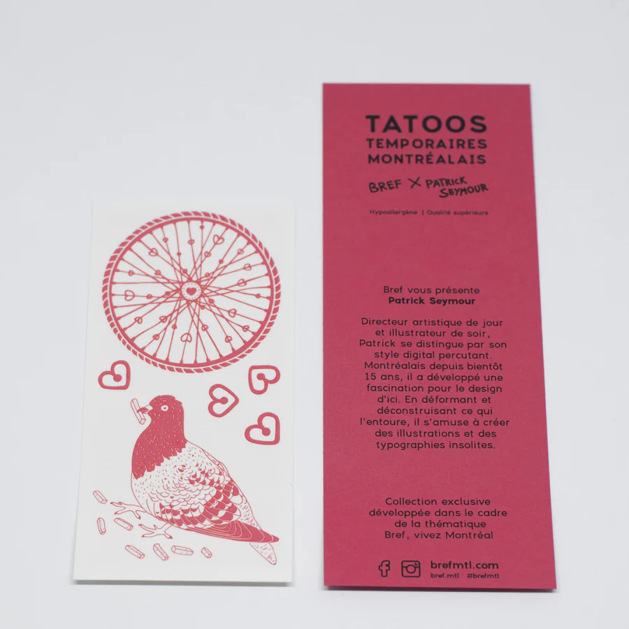Pour vous tatouer votre amour de Montréal, temporairement, on a demandé à l’illustrateur Patrick Seymour d’illustrer ses icônes montréalais. La roue de vélo, le pigeon mangeur de frites et le coeur, composant le logo de Montréal.